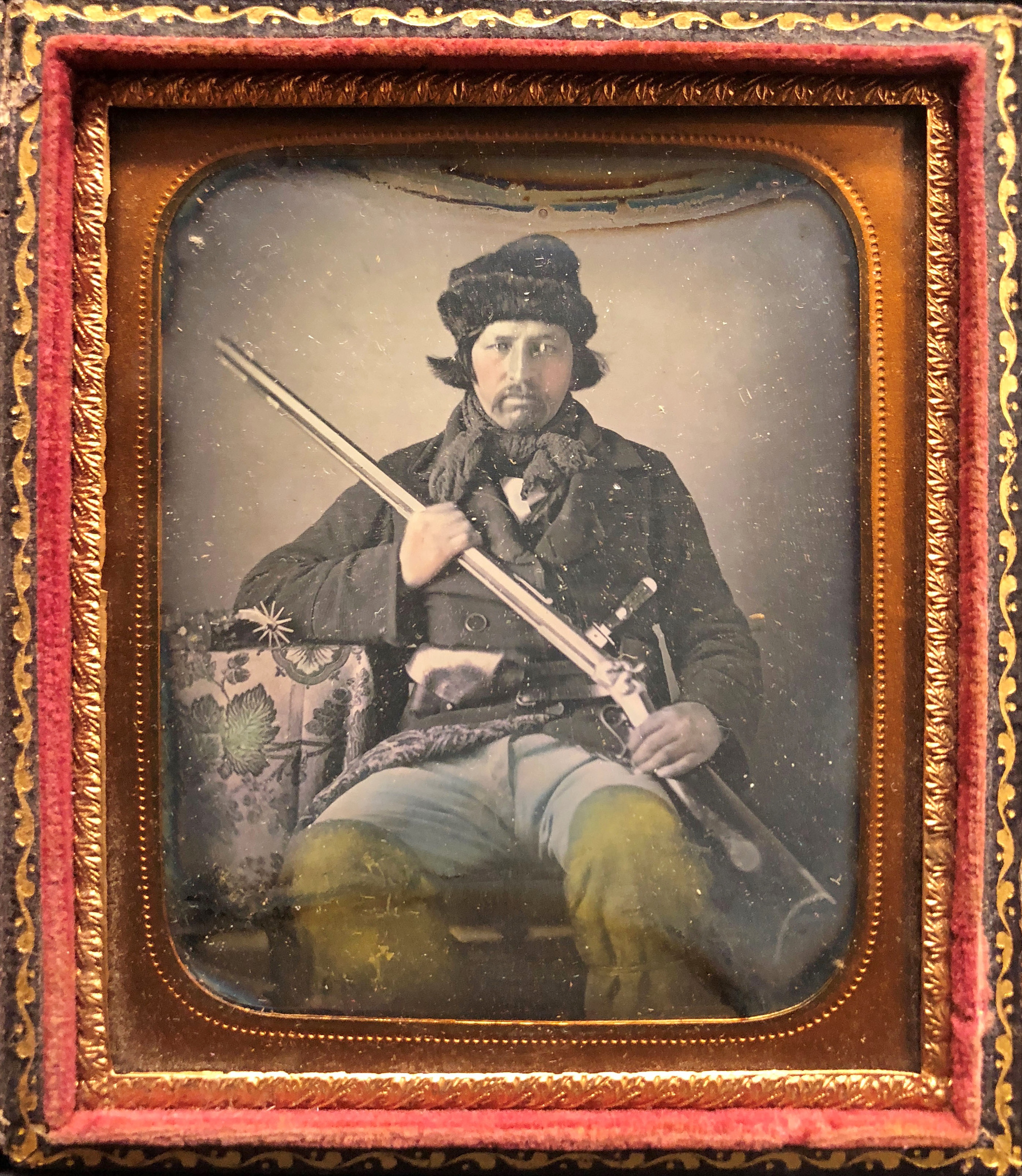 Under the Treaty of 1855, when he was 29, Brown became a United States citizen. Years later he found it impossible to live as such, and believing to have been cheated out of his property, he requested to resume his tribal relations. He eventually moved to the Wyandot reservation in Oklahoma. In this reproduction of the original daguerreotype, he is dressed for a bear hunt.