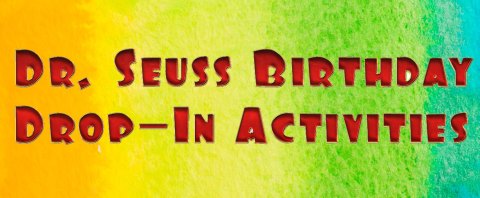 It's Dr. Seuss' birthday this month, and we're celebrating! Drop-in for our self-serve activities tables of crafts & more, each based on a different Seuss book.