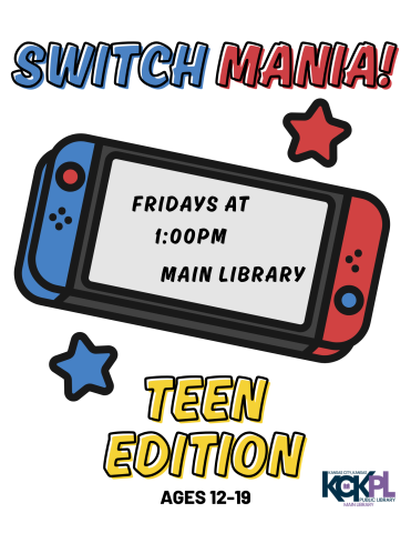 Main Library is pulling out the Nintendo Switch for an afternoon of gaming! Come and join us! Teens Only. Ages 12 to 19.