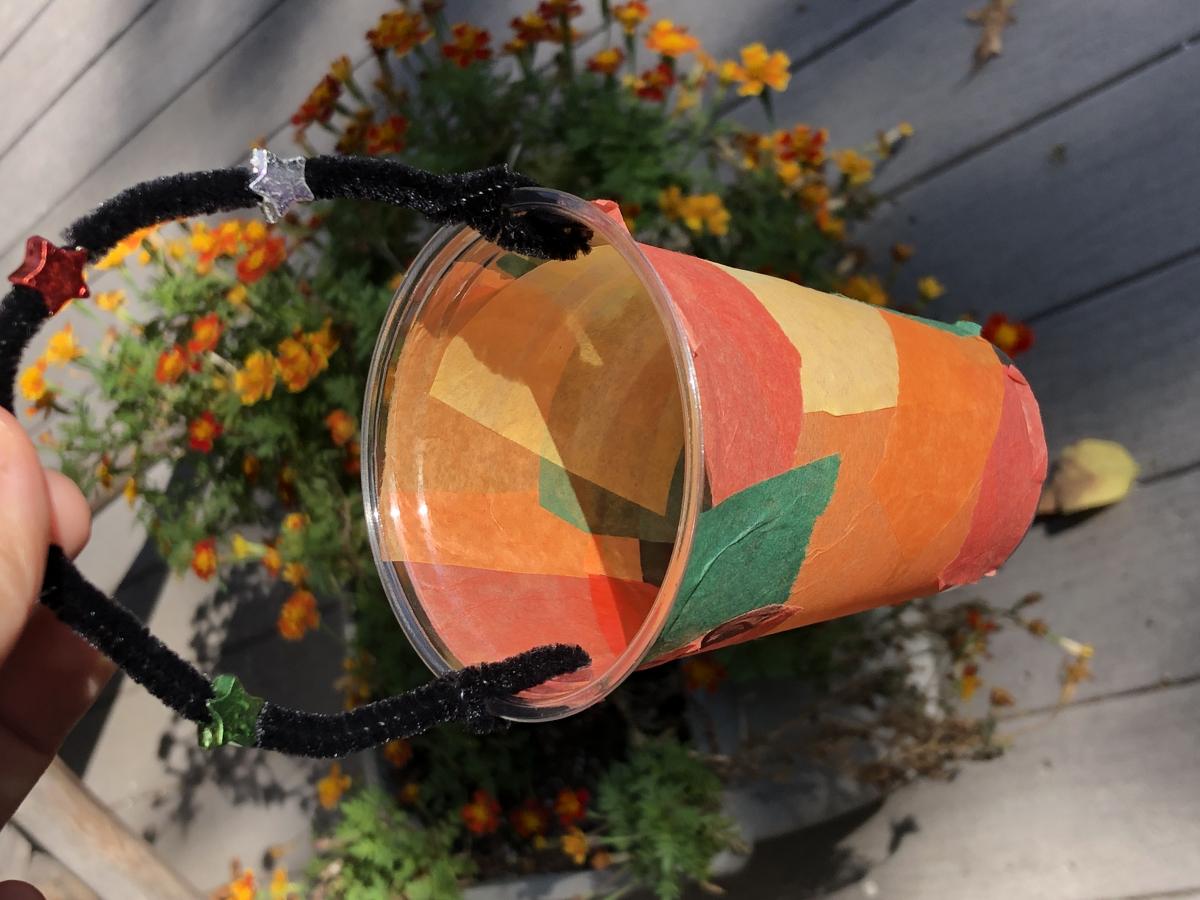 A DIY lantern is held up over a background of gold and orange flowers.