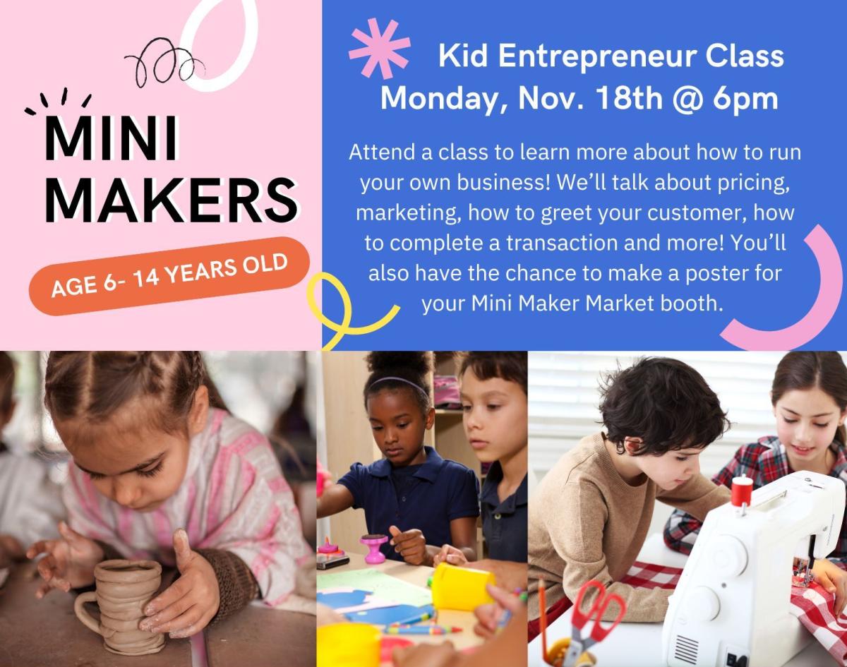 flyer for Kid Entrepreneur class, includes photos of children making arts and crafts