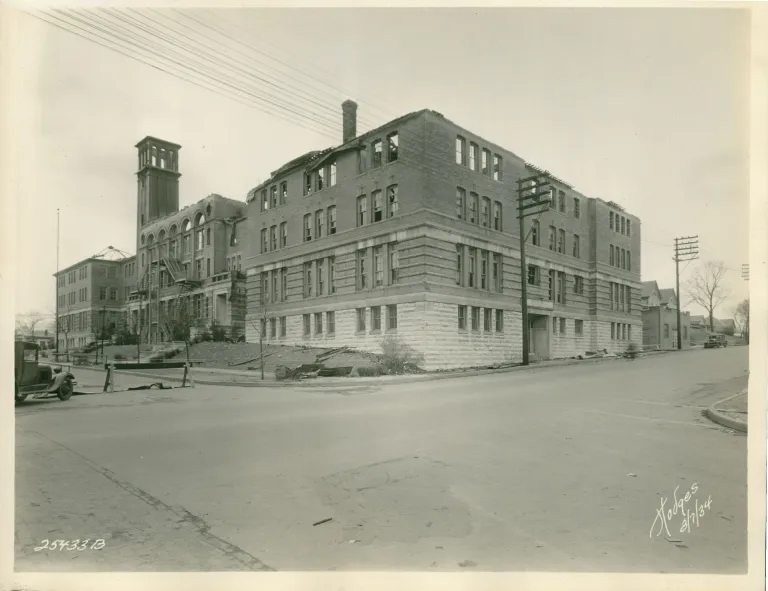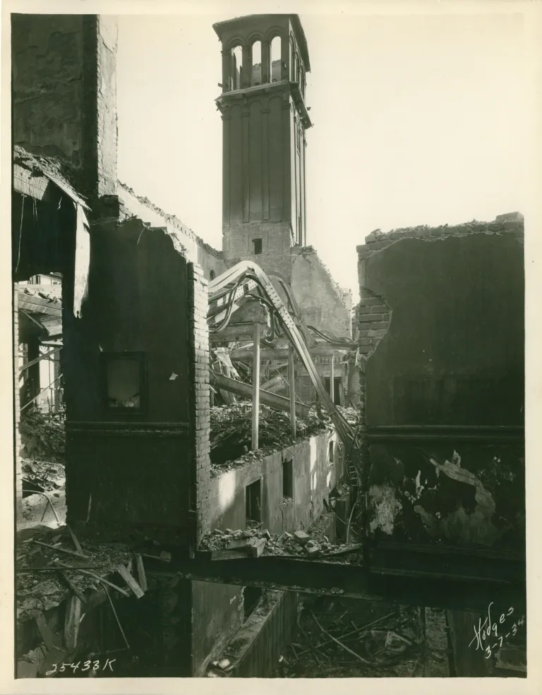 This situation suddenly changed on March 3, 1934. A fire, thought to have originated in burning trash in a janitorial storage room, swept through the timber-framed, brick-walled school building. The first alarm came at about 6:30 p.m., but efforts to halt the blaze were futile. The fire was the most spectacular in city history; people can still recall seeing the blaze from many miles away, the flames shooting through the roof of the three-story building, and the brick walls glowing like a blast furnace. No one was seriously injured, but the estimated loss was $750,000 when the building was insured for only $336,000.